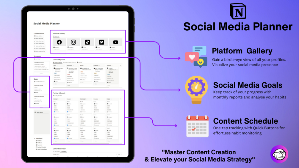 Are you tired of juggling multiple spreadsheets, documents, and calendars to manage your social media content? Streamline your content creation process with our feature-packed Social Media Planner built right into Notion. Whether you're a social media manager, influencer, or small business owner, this powerful tool is designed to simplify your life and supercharge your online presence.