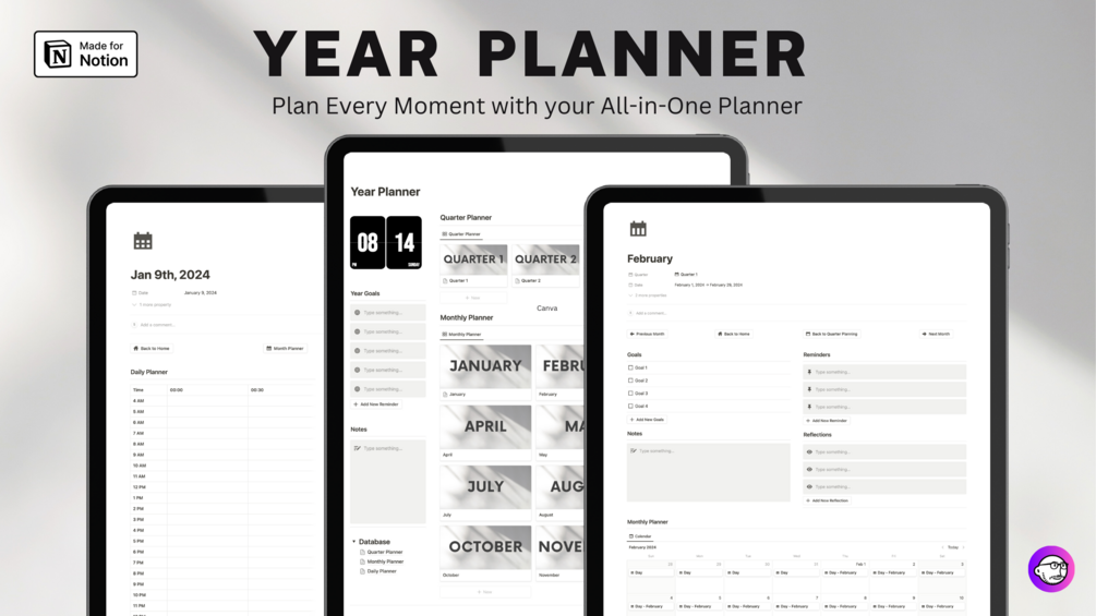 The Notion Year Planner is your ultimate goal-smashing tool, packing Day, Month, Quarter, and Year planners into one single powerful dashboard. Crafted to turn your big dreams into bite-sized, achievable steps.